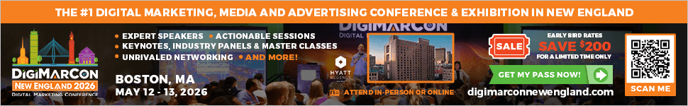 The 8th Annual DigiMarCon New England—the leading Digital Marketing, Media, and Advertising Conference & Exhibition in New England—returns May 12th to 13th, 2026, to the stunning Hyatt Regency Boston Hotel in Boston, Massachusetts. Join industry leaders, innovators, and peers in-person or online for 2 action-packed days of cutting-edge strategies, emerging trends, and game-changing technologies in AdTech, MarTech, SaaS, and more.